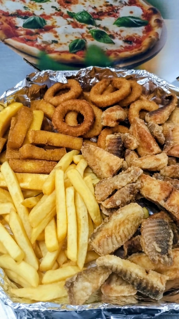 600 gramas de filé de tilápia 15 unidades de polenta 10 unidades de anéis de cebola 250 gramas de batata frita OBS: As porções são pesadas cruas.